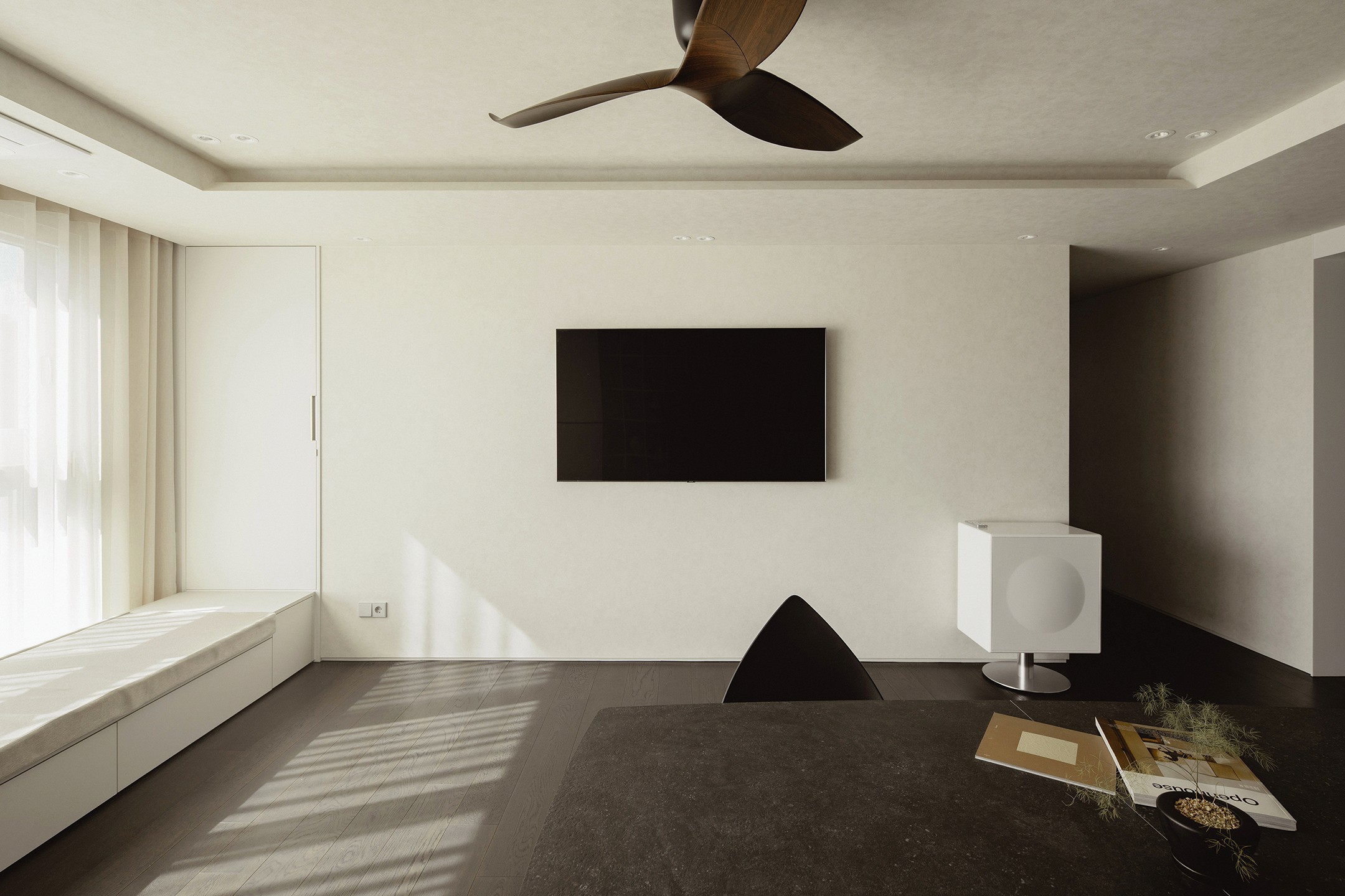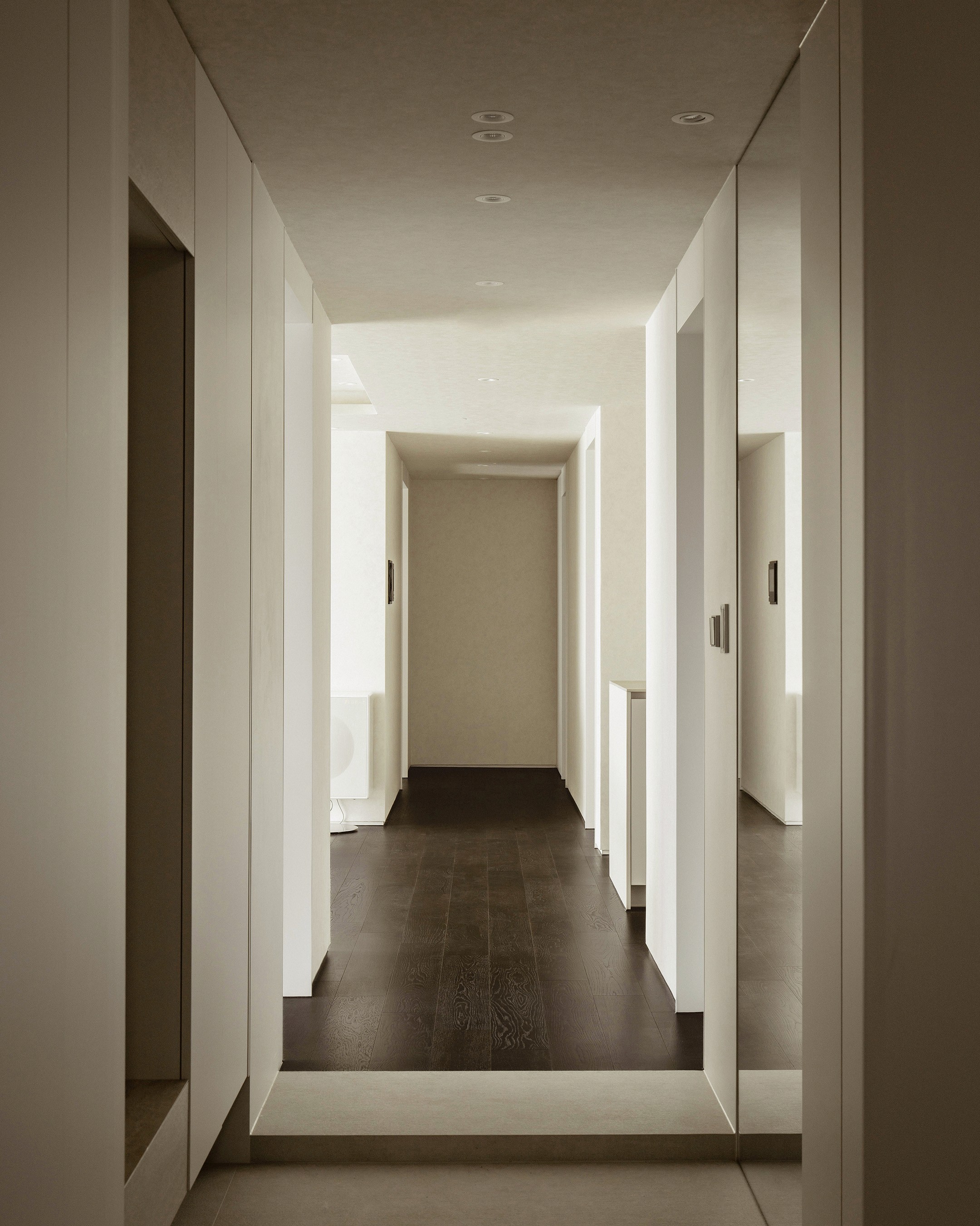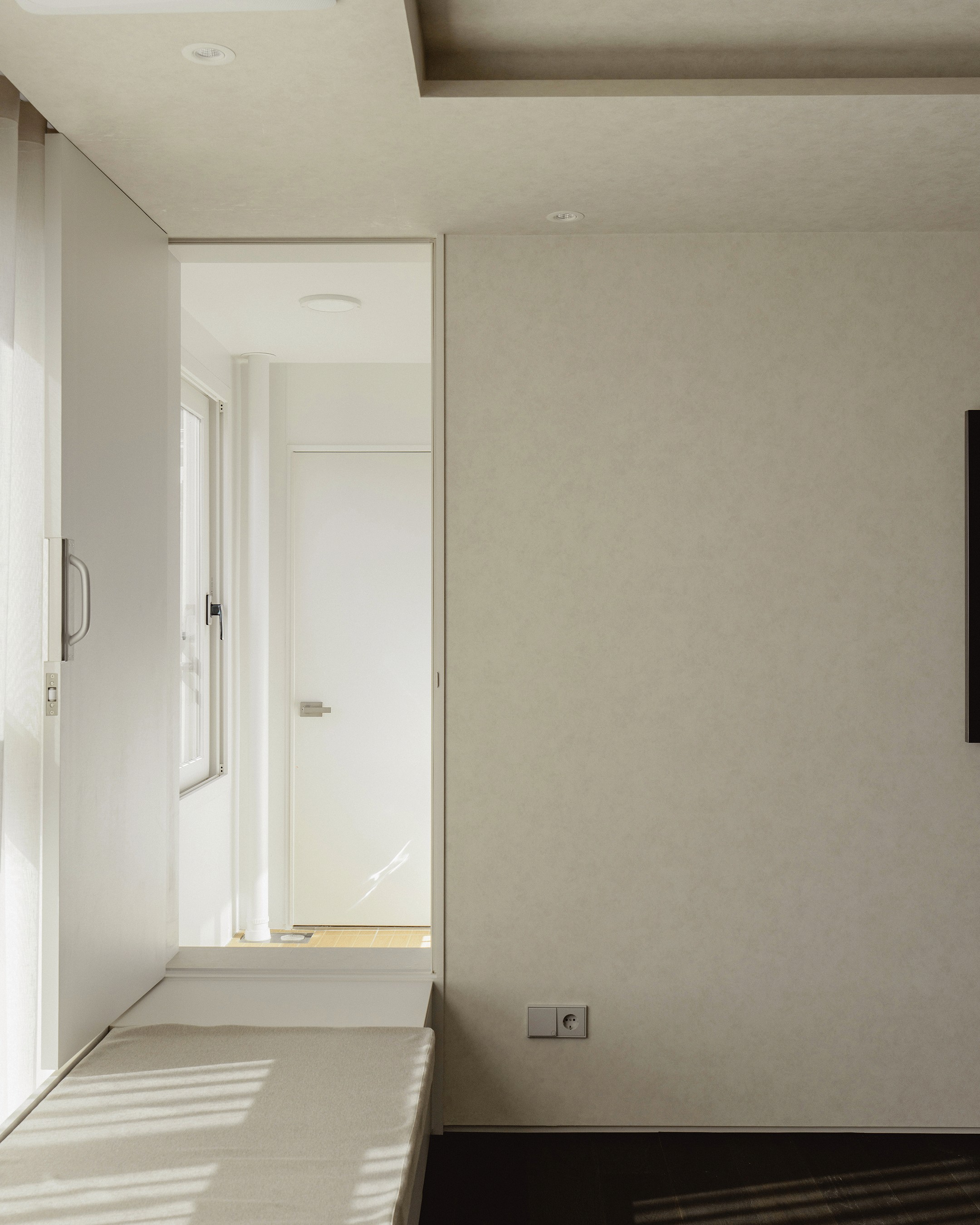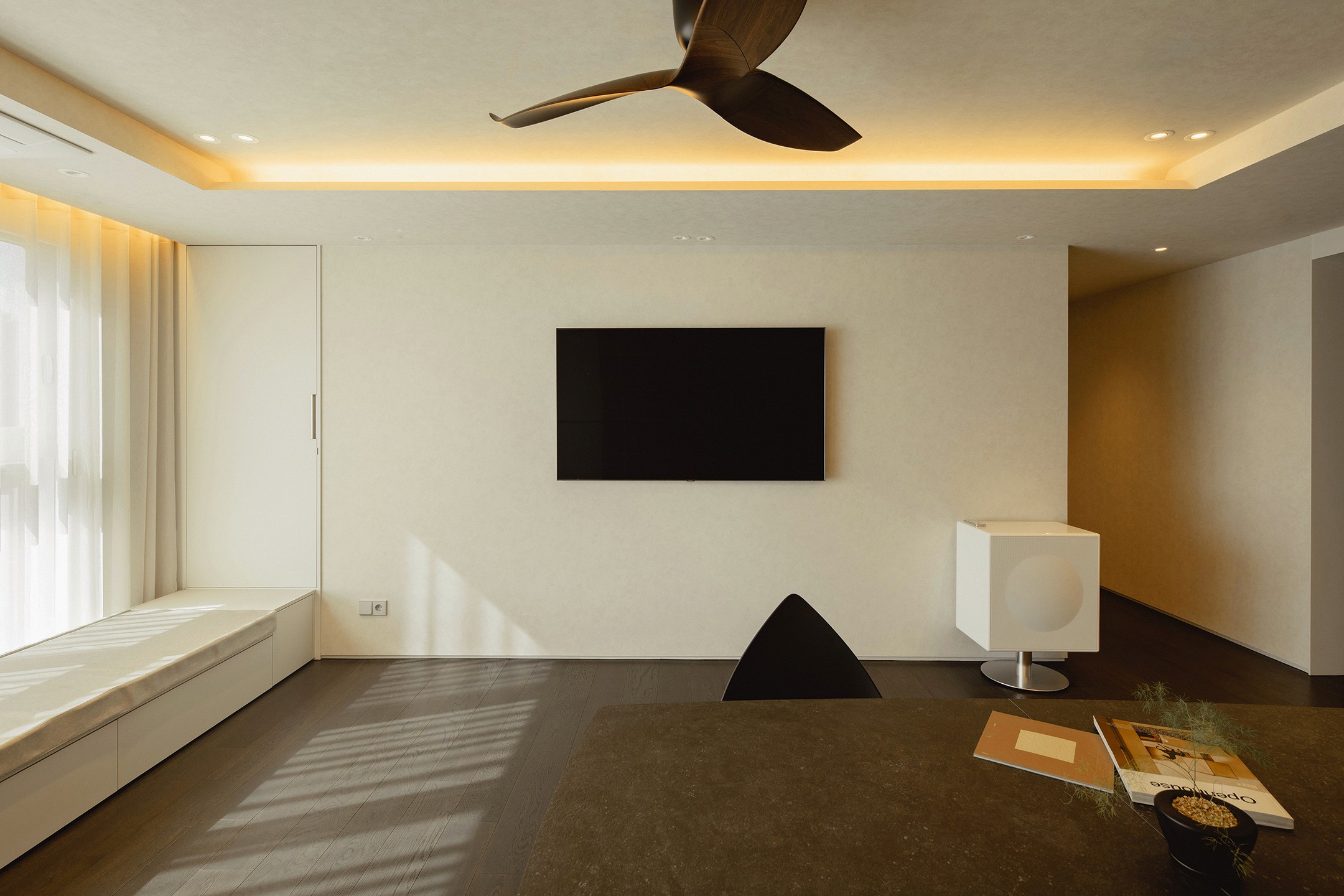 차분한 원목 바닥과 미니멀한 벽 마감이 대비를 이루고,
