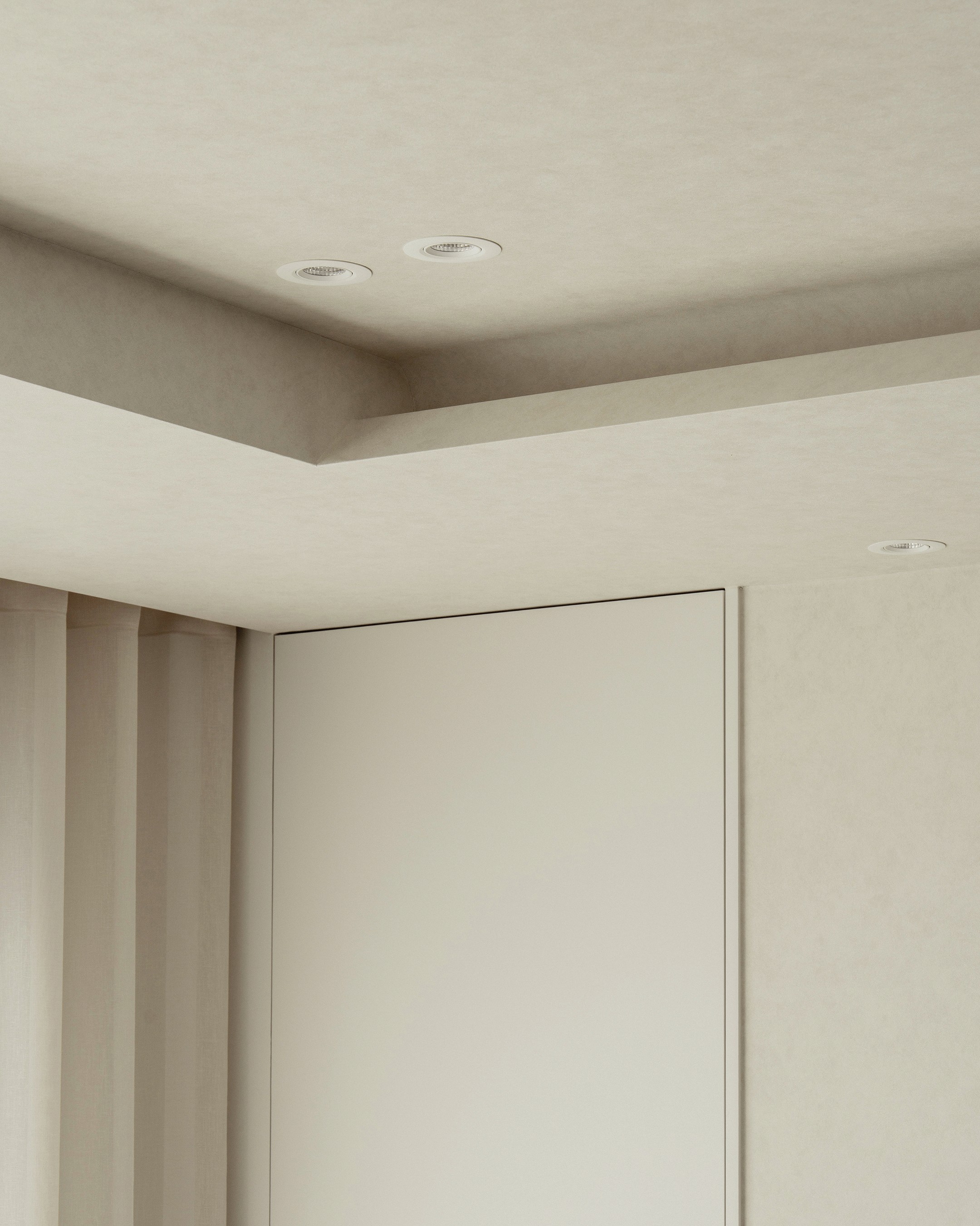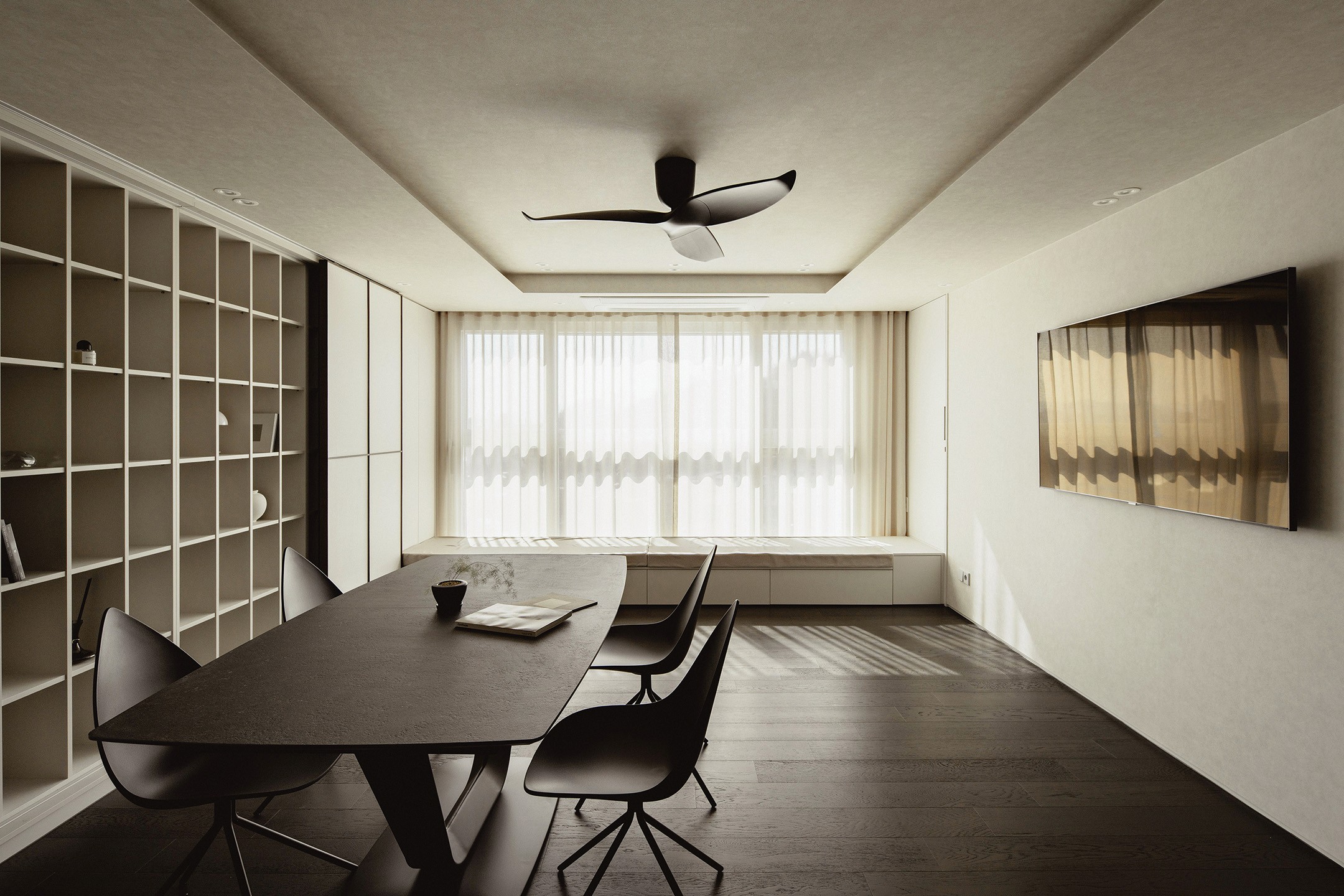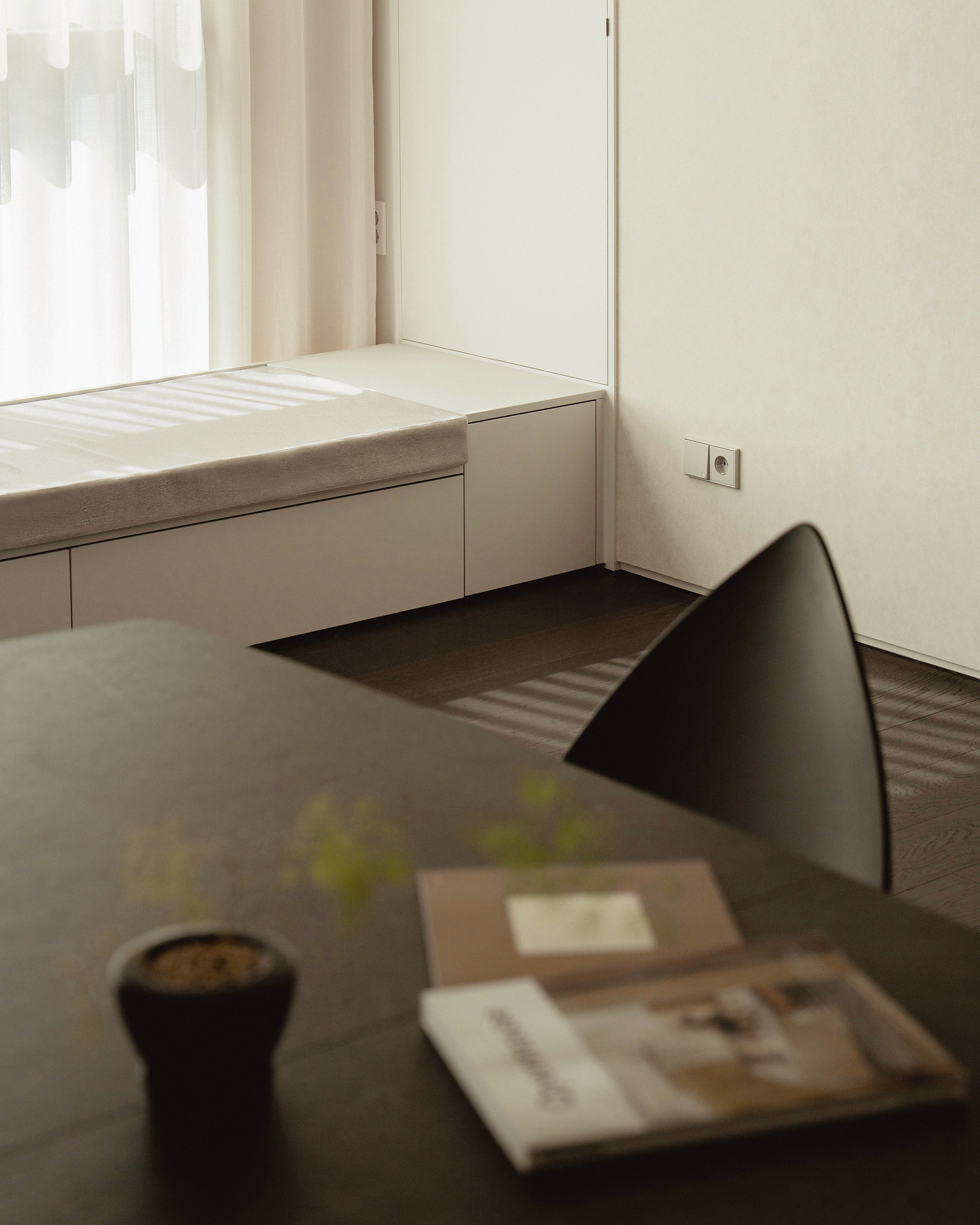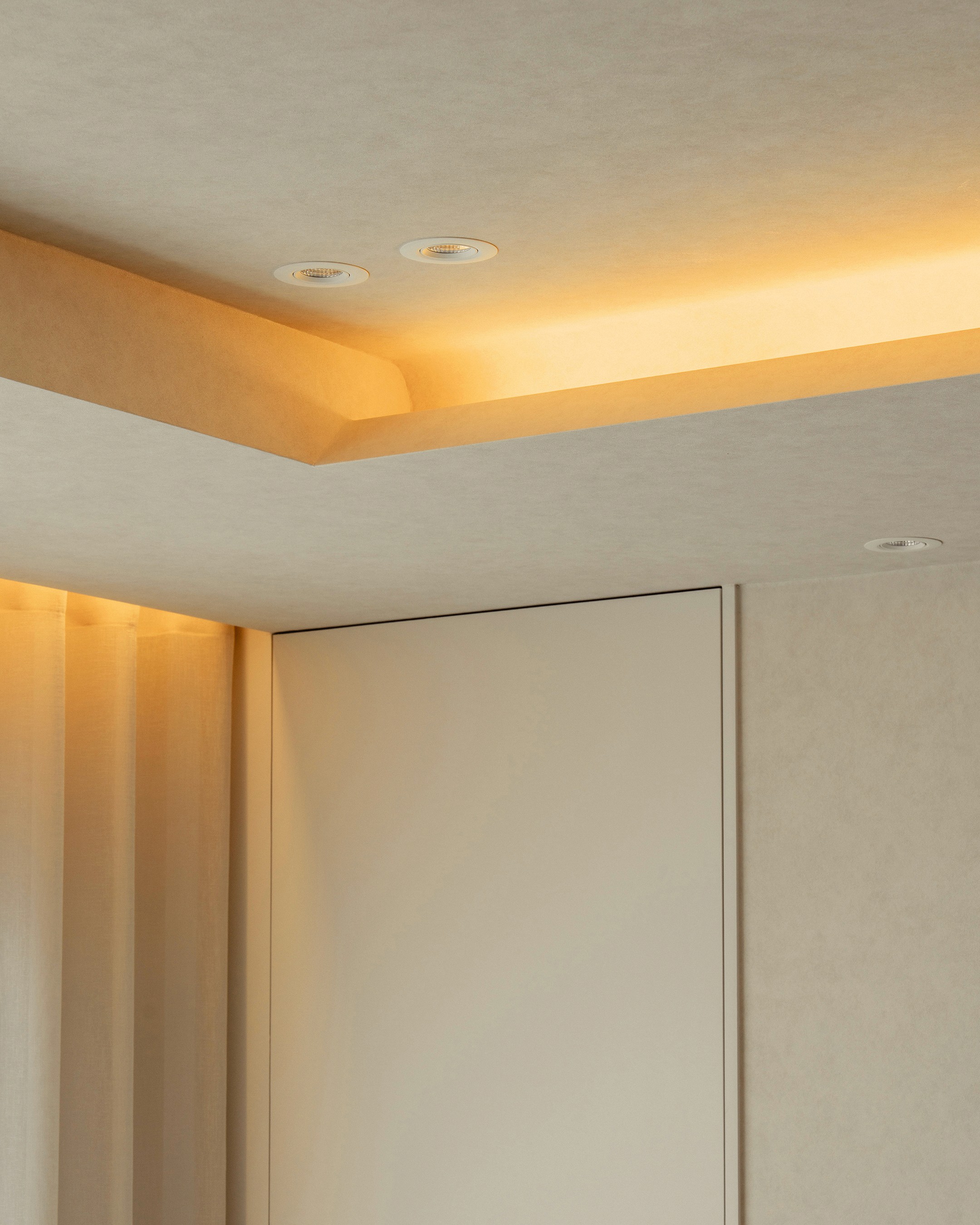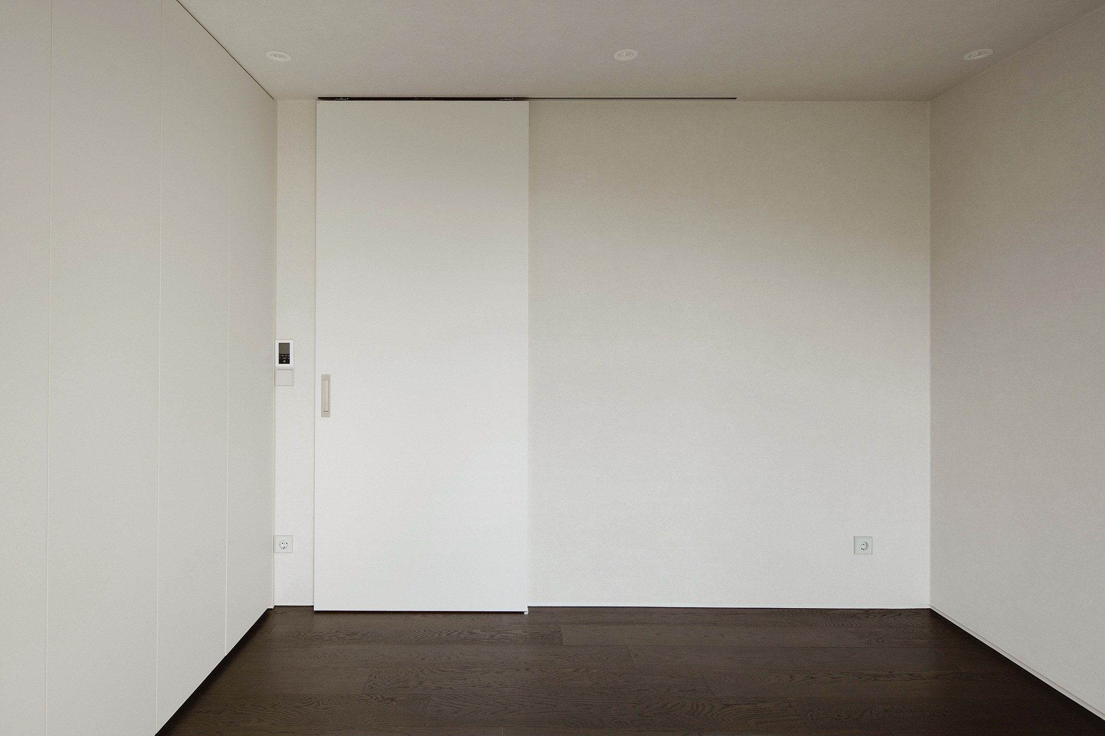 차분한 원목 바닥과 미니멀한 벽 마감이 대비를 이루고,