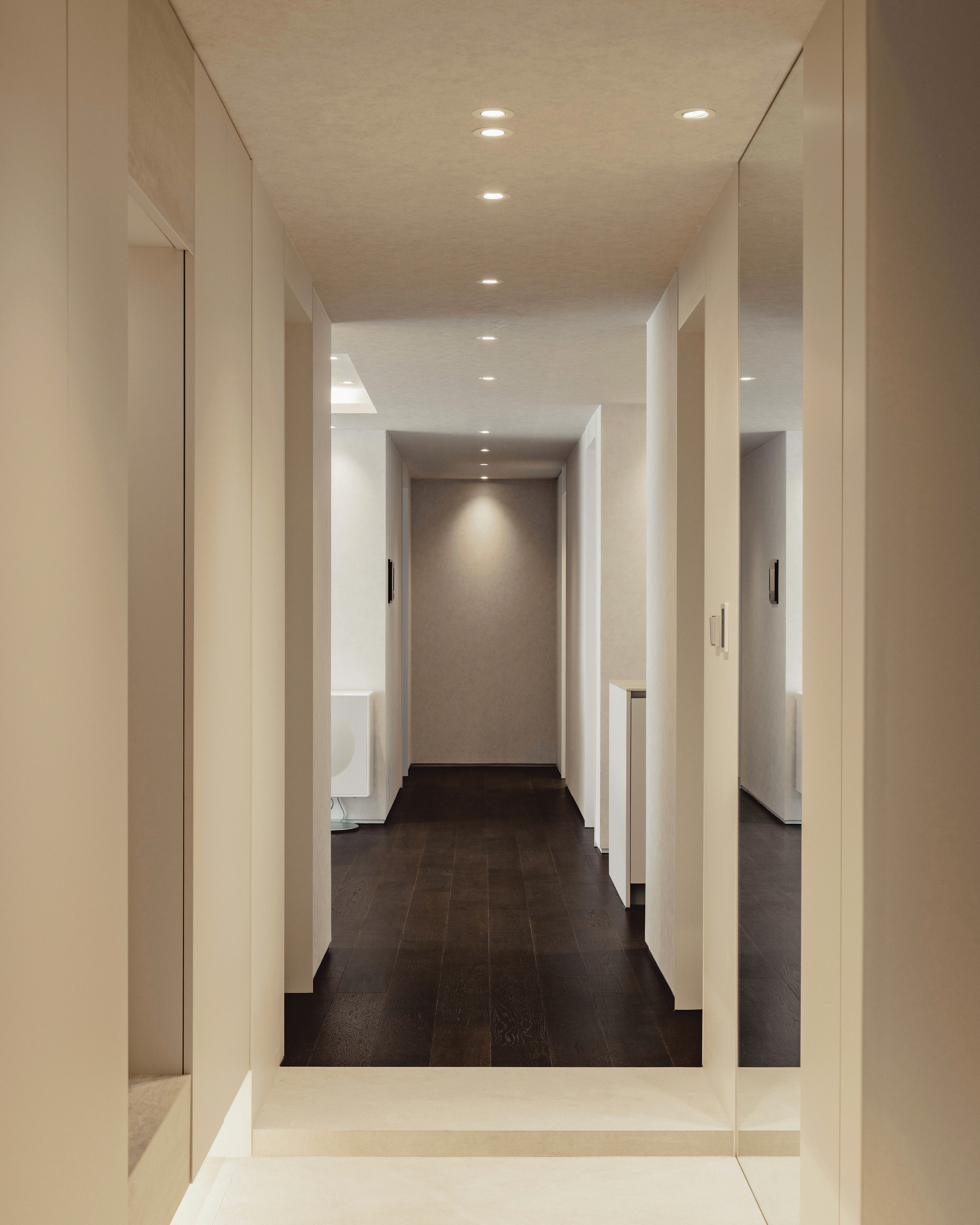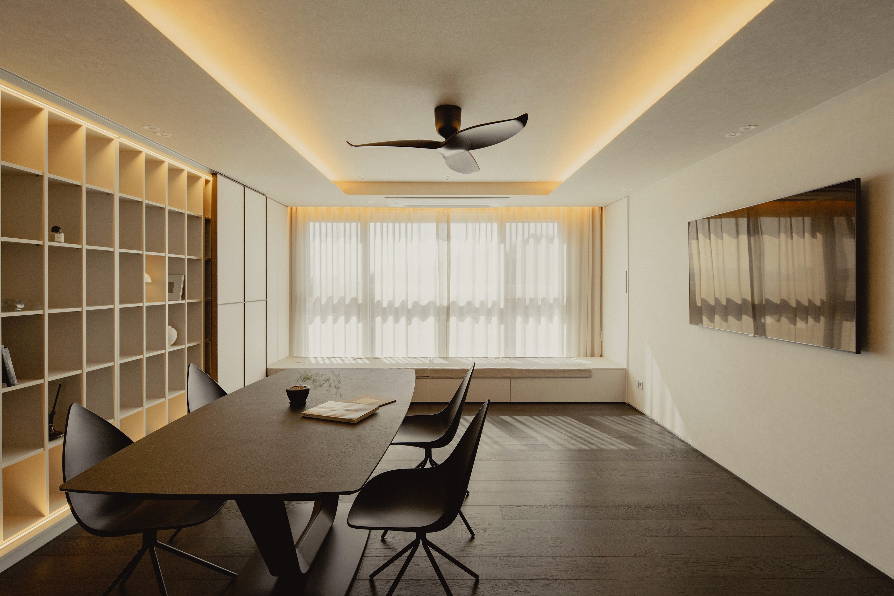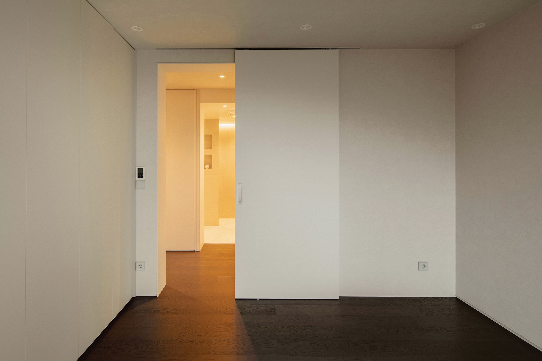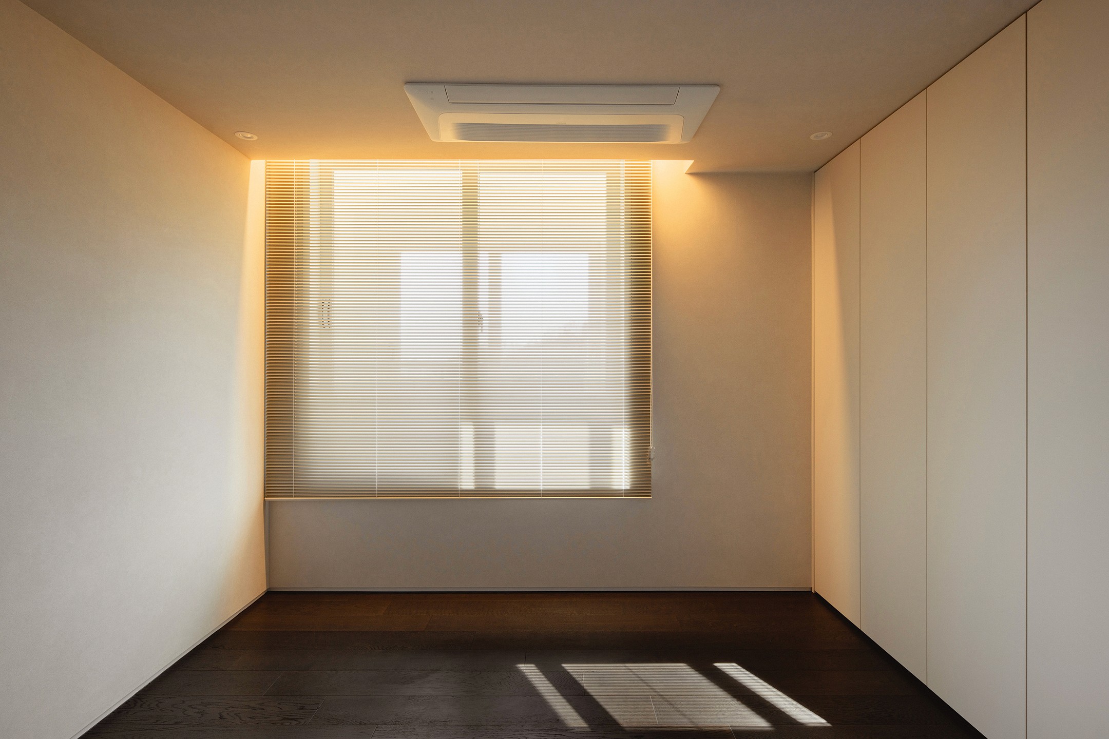 차분한 원목 바닥과 미니멀한 벽 마감이 대비를 이루고,