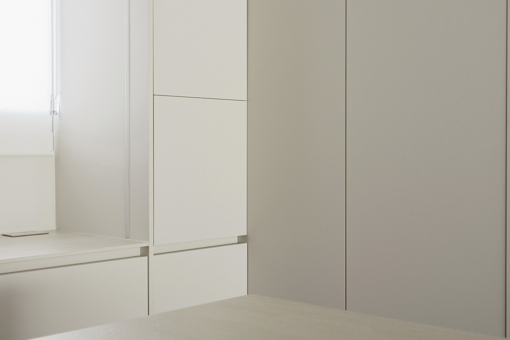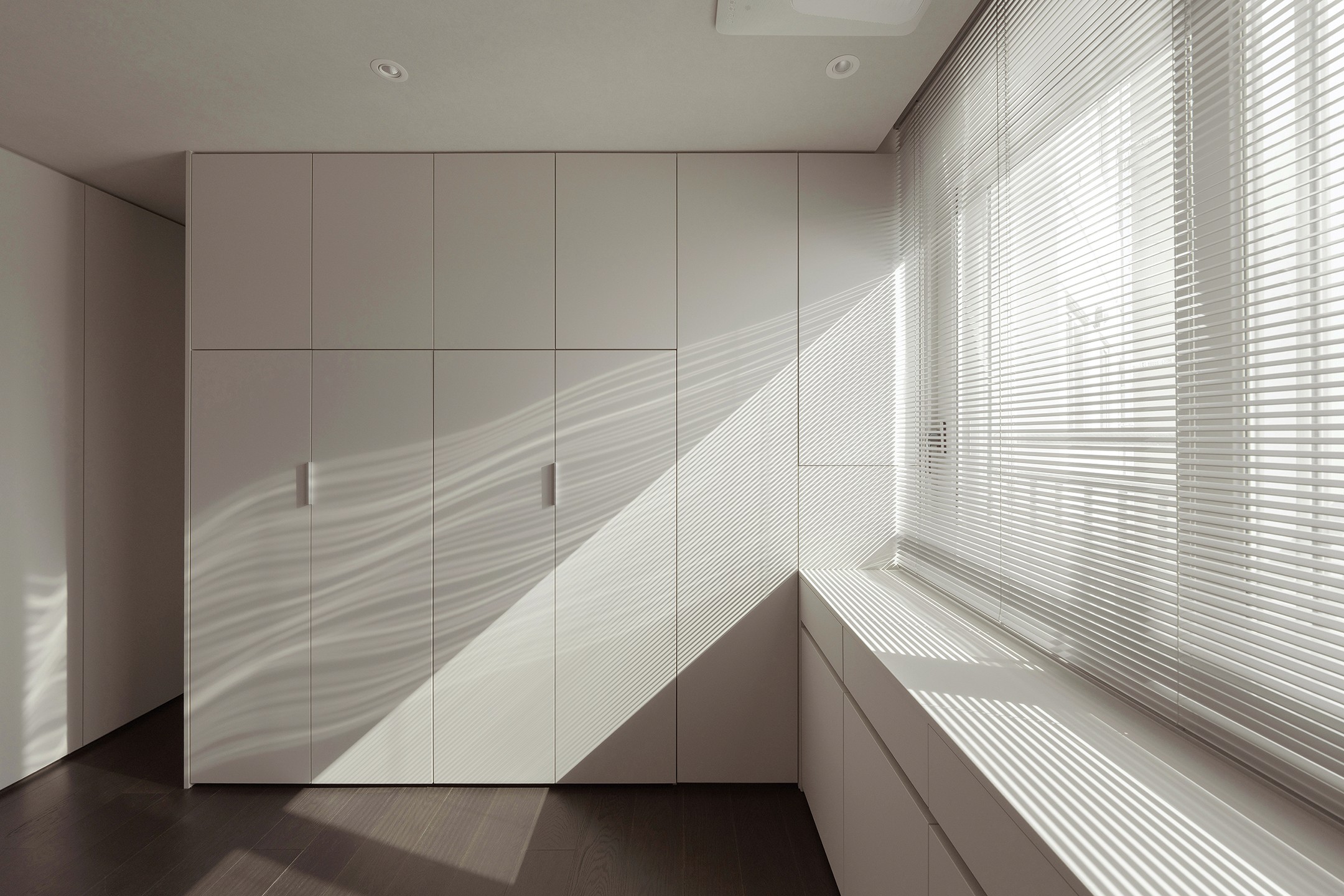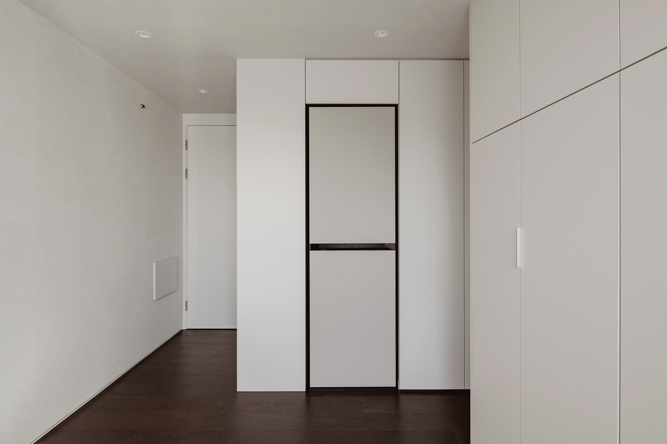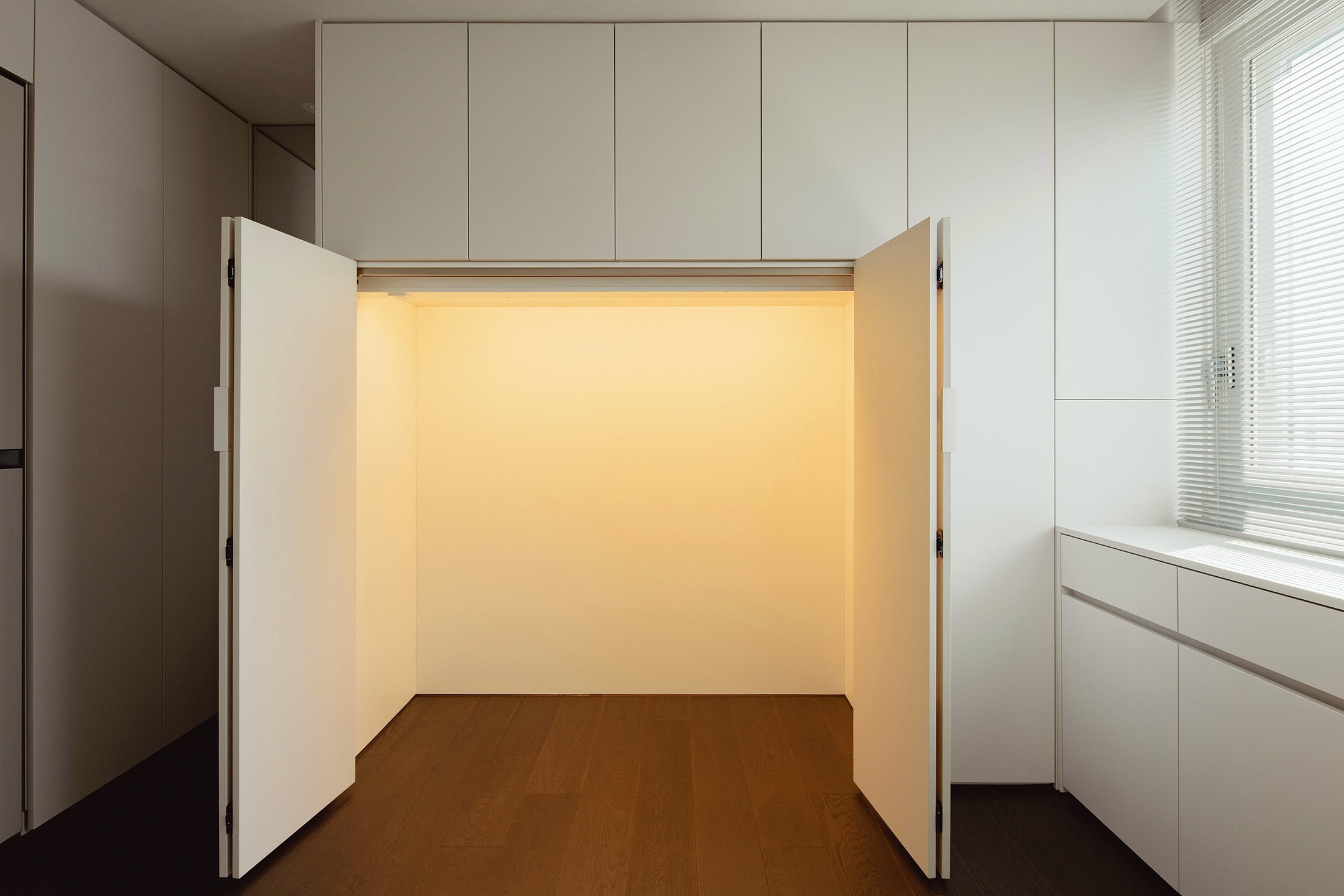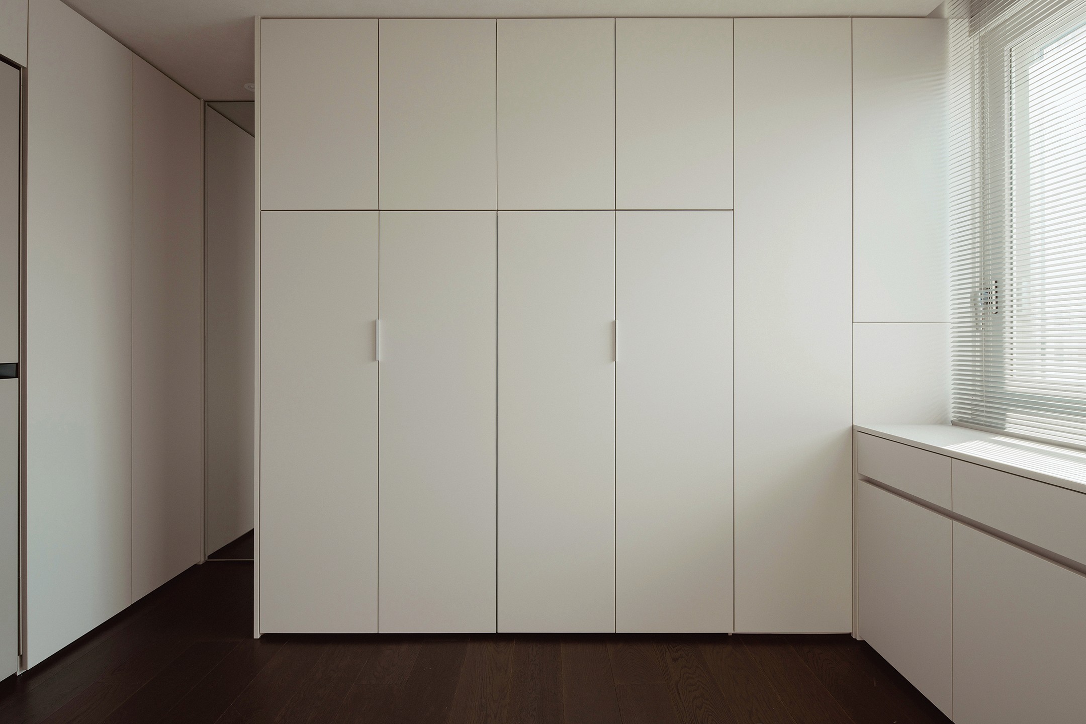 차분한 원목 바닥과 미니멀한 벽 마감이 대비를 이루고, 전반적인 수납이 잘 정돈되어 있어,