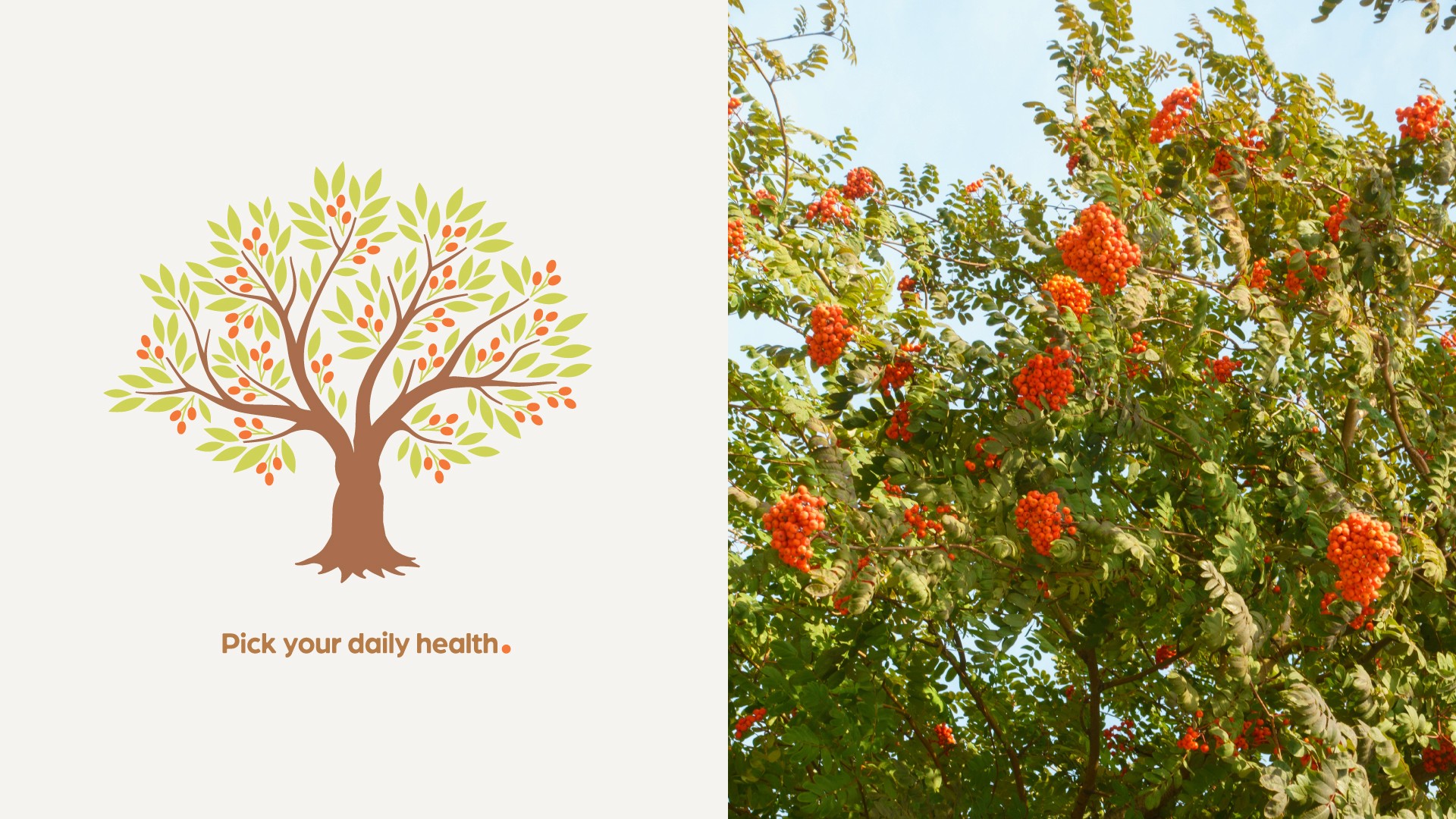 빨간 열매가 가득 열리는 소버스 나무에 ‘매일 열리는 건강’ (Pick your daily health).