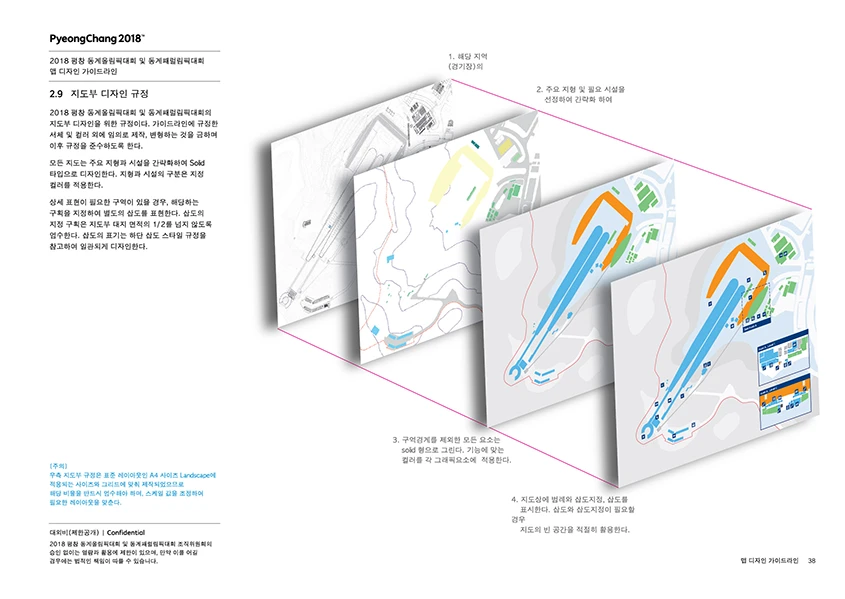 우리는 숙련된 평창올림픽 지도 디자이너가 됨과 동시에 노하우를 전수해야 하는 교육자가 되어야 했습니다. 언제 누가 지도를 만들게 되어도 그 것들이 전부 비슷한 느낌으로 그려질 수 있길 바라는 마음으로 가이드라인을 만들었습니다. 올림픽이 거의 끝난 지금, 우리는 지도 뿐만 아니라 지도 그리는 방법 또한 이해하기 쉬웠었기를 기도하고있습니다.