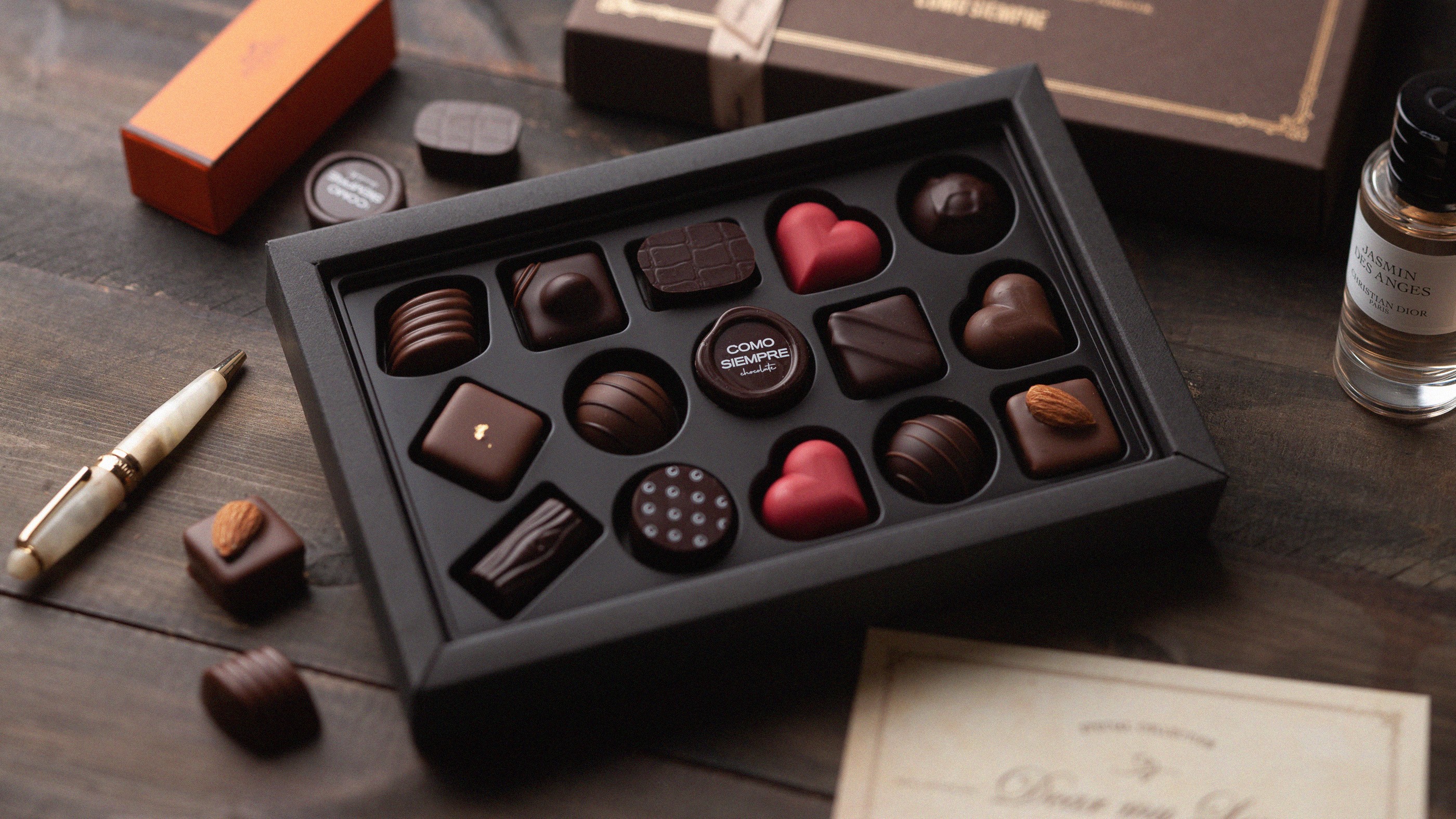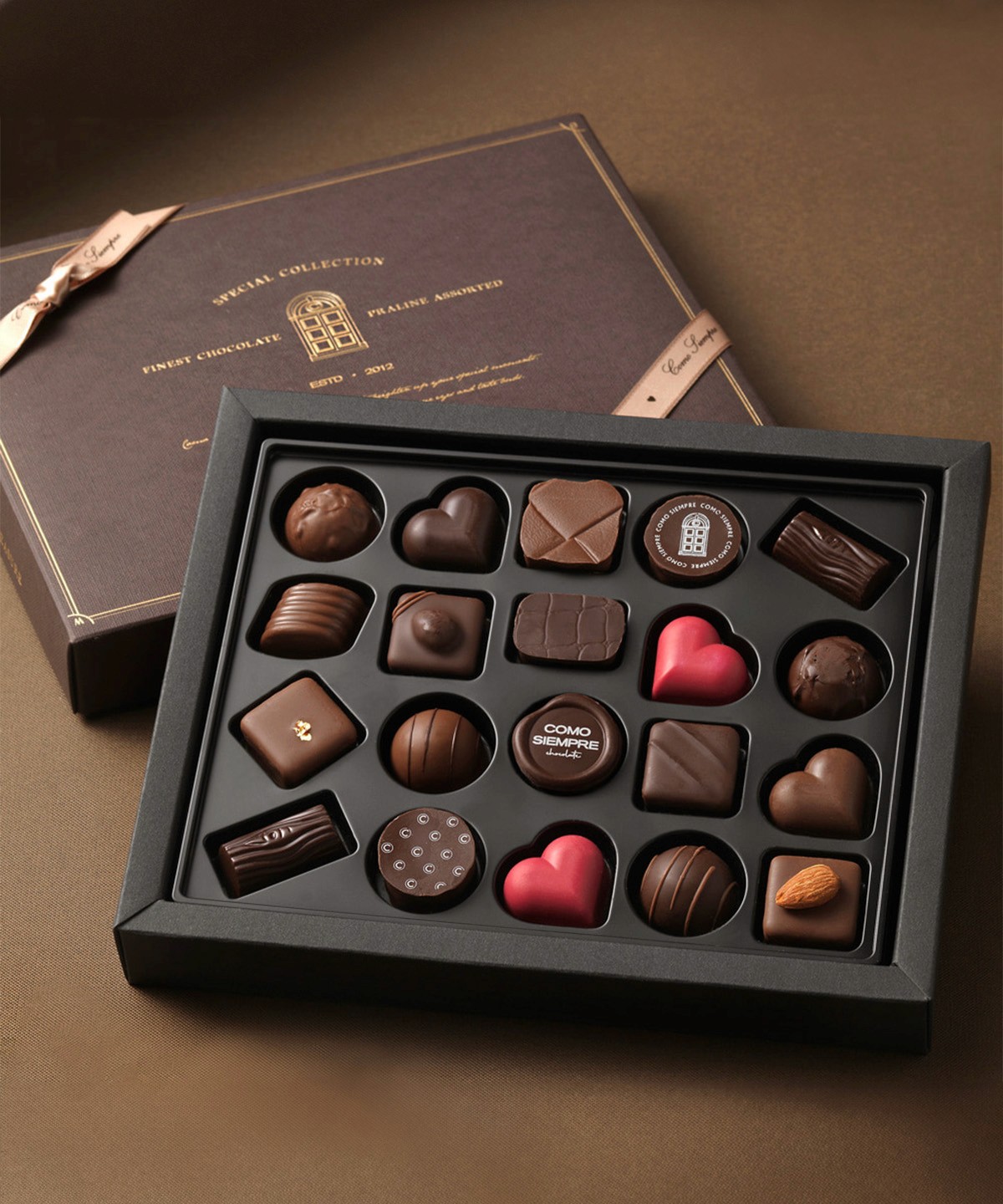 꼬모쎔쁘레의 수제 초콜릿은 까다로운 초콜릿 플래너들이 늘 새로운 초콜릿을 기획합니다. 소중한 사람을 위한 사랑의 선물이 필요한 순간, 꼬모쎔쁘레를 준비하세요. 초콜릿 마스터의 특별한 레시피로 만들어진 꼬모쎔쁘레를 대표하는 프랄린 초콜릿 (Praline chocolate)으로 초콜릿 애호가들에게 꾸준히 사랑받고 있습니다. 초콜릿 마스터의 특별한 레시피로 만들어 입 안에 넣는 순간 달콤함이 퍼지는 수제 초콜릿의 맛을 느껴보세요. 특별한 날, 특별한 이에게 달콤함을 더해줄 꼬모쎔쁘레 시그니쳐 초콜릿으로 여러분의 품격을 선물하세요.