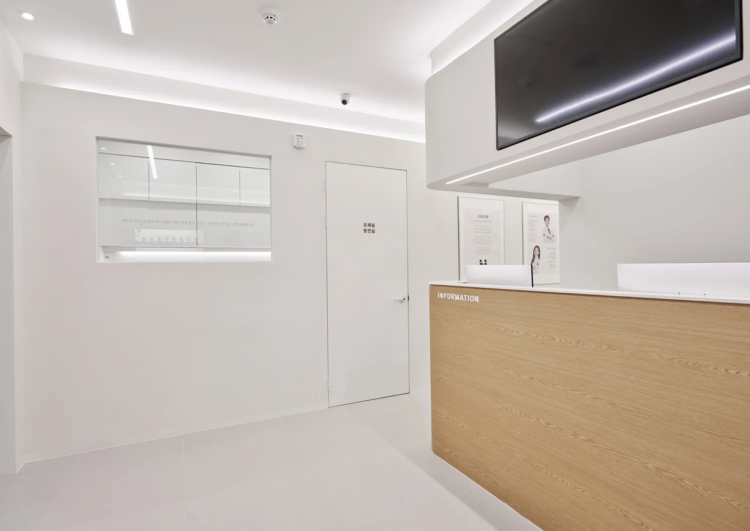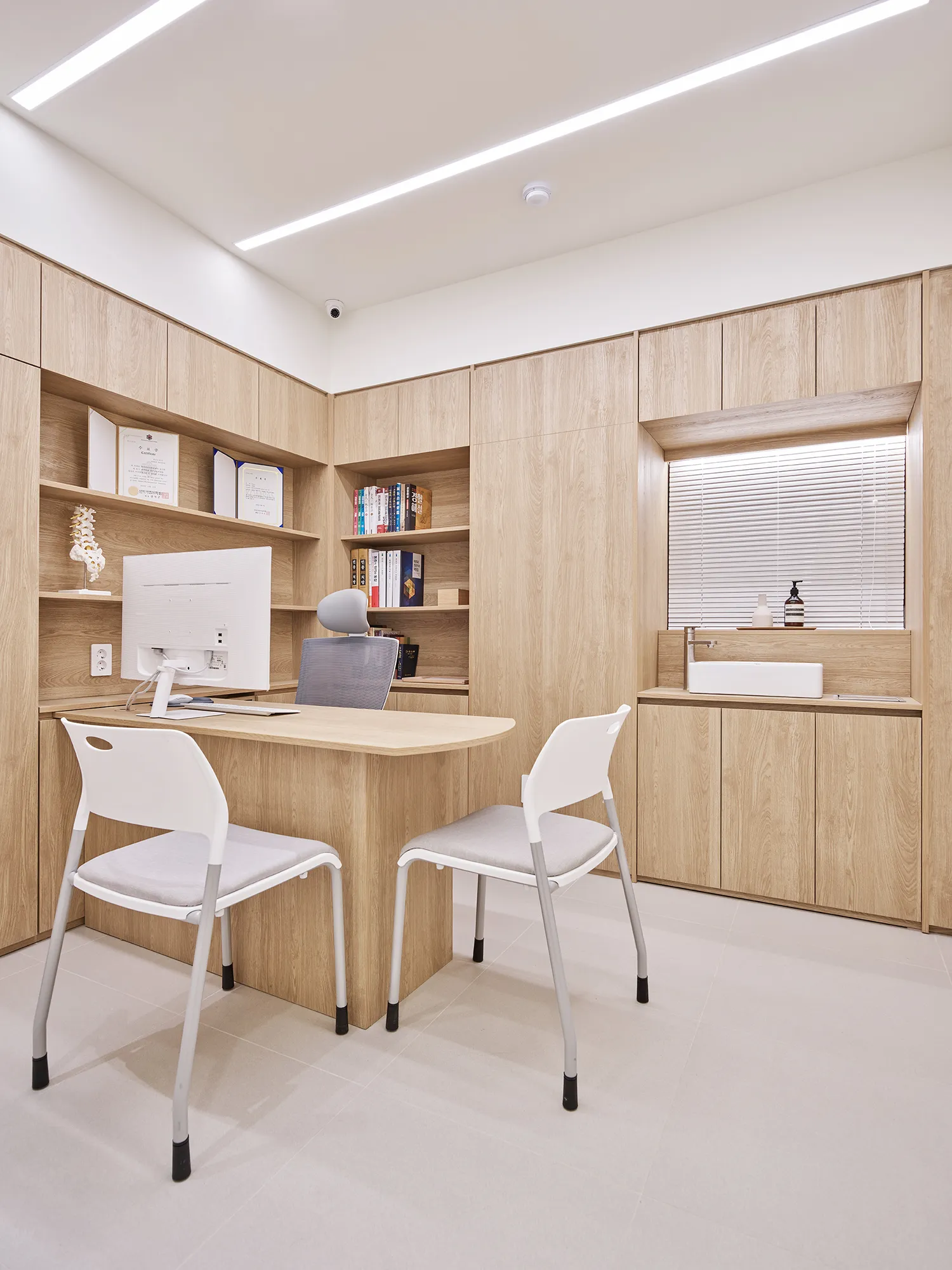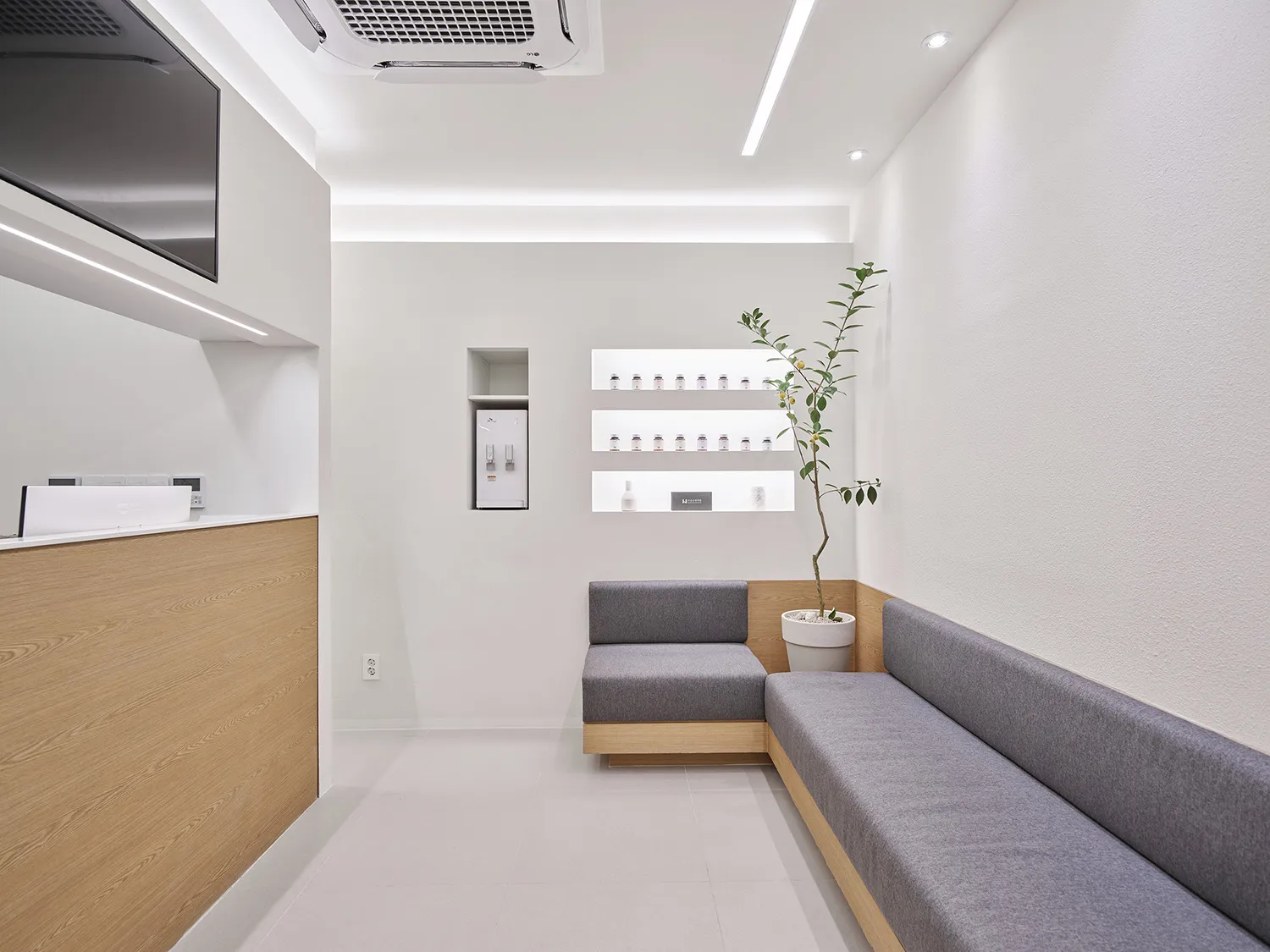 이음손한의원의 원장님들께선 깨끗하고 정돈되어서 믿을 수 있고 정직한 느낌의 공간을 만들기를 원하셨습니다. 특히 위생과 안전을 최우선으로 해야하는 탕전실과 조제실, 치료실 디자인에 그러한 이미지를 만들기 위해 신경을 썼습니다. 하지만 환자들과의 터치, 즉 ‘교감’이 이루어지는 곳에는 우드의 따뜻함을 넣어 편안한 분위기를 만드는 것이 좋겠다는 생각이었습니다. 이음손한의원의 접수처와 진료실은 따뜻한 색의 우드시트로 마감이 되어 있어 깨끗한 공간에서 약간 긴장했을 고객들이 조금 더 편안한 마음으로 스태프와 원장님과 커뮤니케이션을 나눌 수 있습니다.