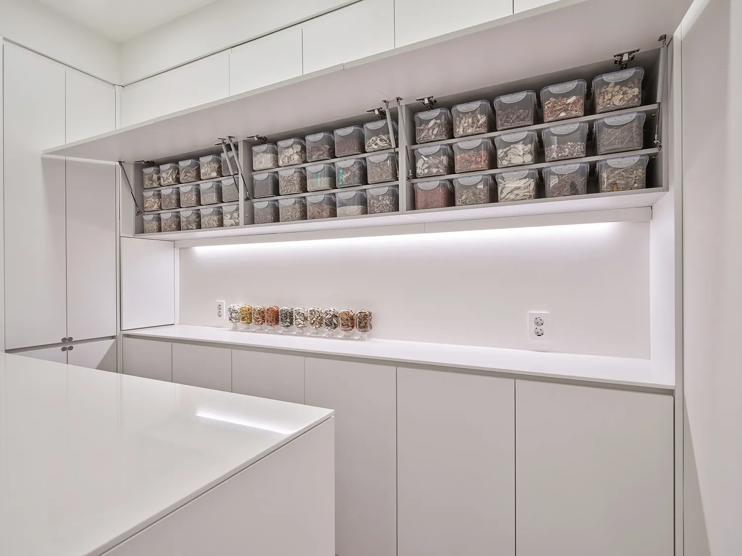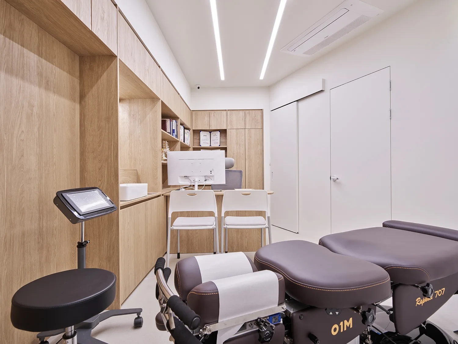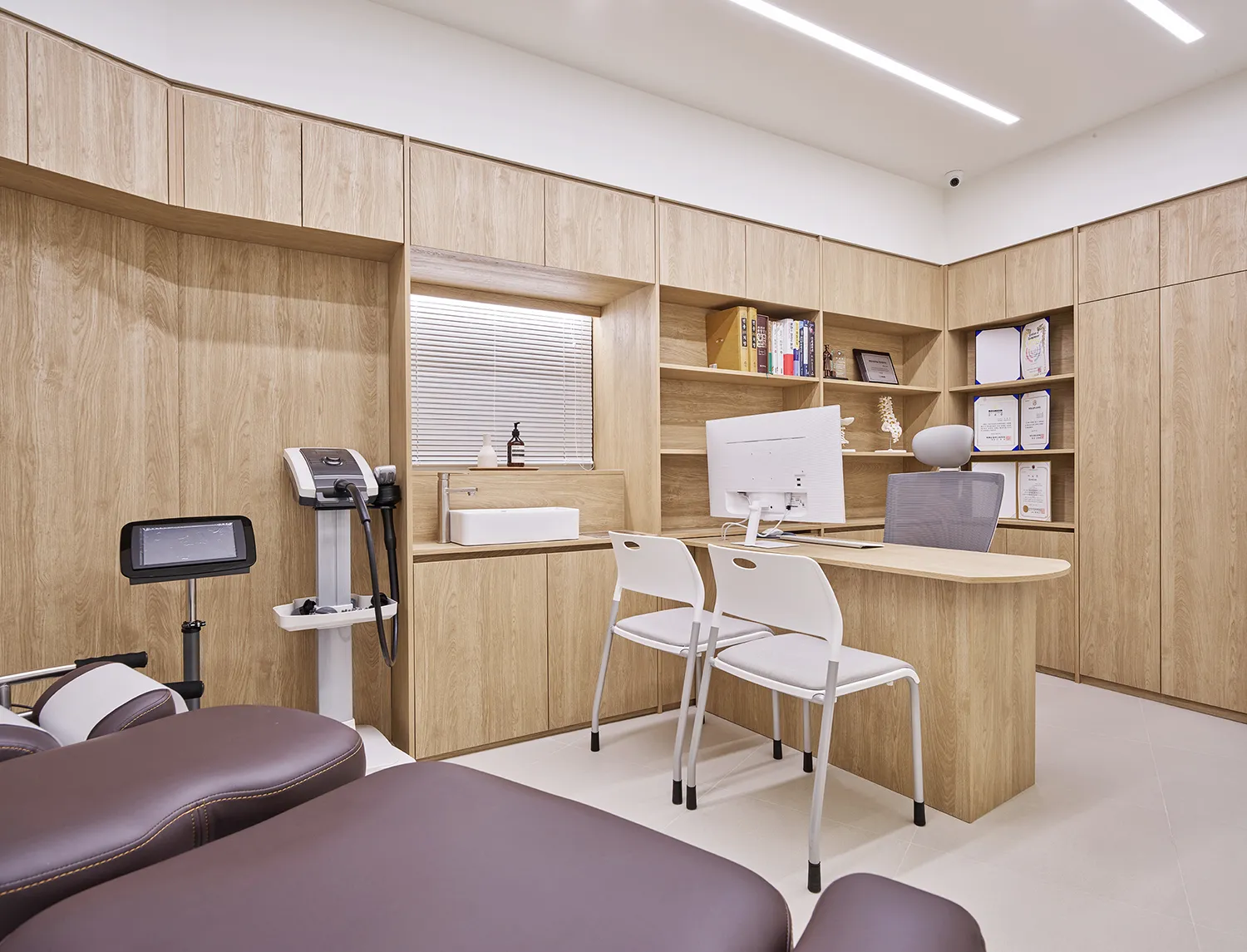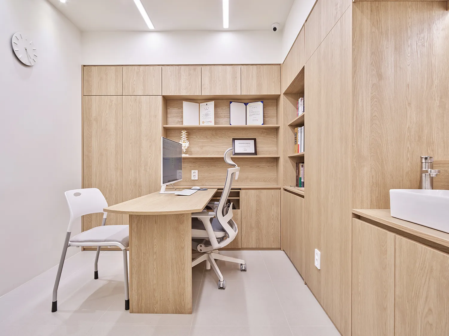 이음손한의원의 원장님들께선 깨끗하고 정돈되어서 믿을 수 있고 정직한 느낌의 공간을 만들기를 원하셨습니다. 특히 위생과 안전을 최우선으로 해야하는 탕전실과 조제실, 치료실 디자인에 그러한 이미지를 만들기 위해 신경을 썼습니다. 하지만 환자들과의 터치, 즉 ‘교감’이 이루어지는 곳에는 우드의 따뜻함을 넣어 편안한 분위기를 만드는 것이 좋겠다는 생각이었습니다. 이음손한의원의 접수처와 진료실은 따뜻한 색의 우드시트로 마감이 되어 있어 깨끗한 공간에서 약간 긴장했을 고객들이 조금 더 편안한 마음으로 스태프와 원장님과 커뮤니케이션을 나눌 수 있습니다.