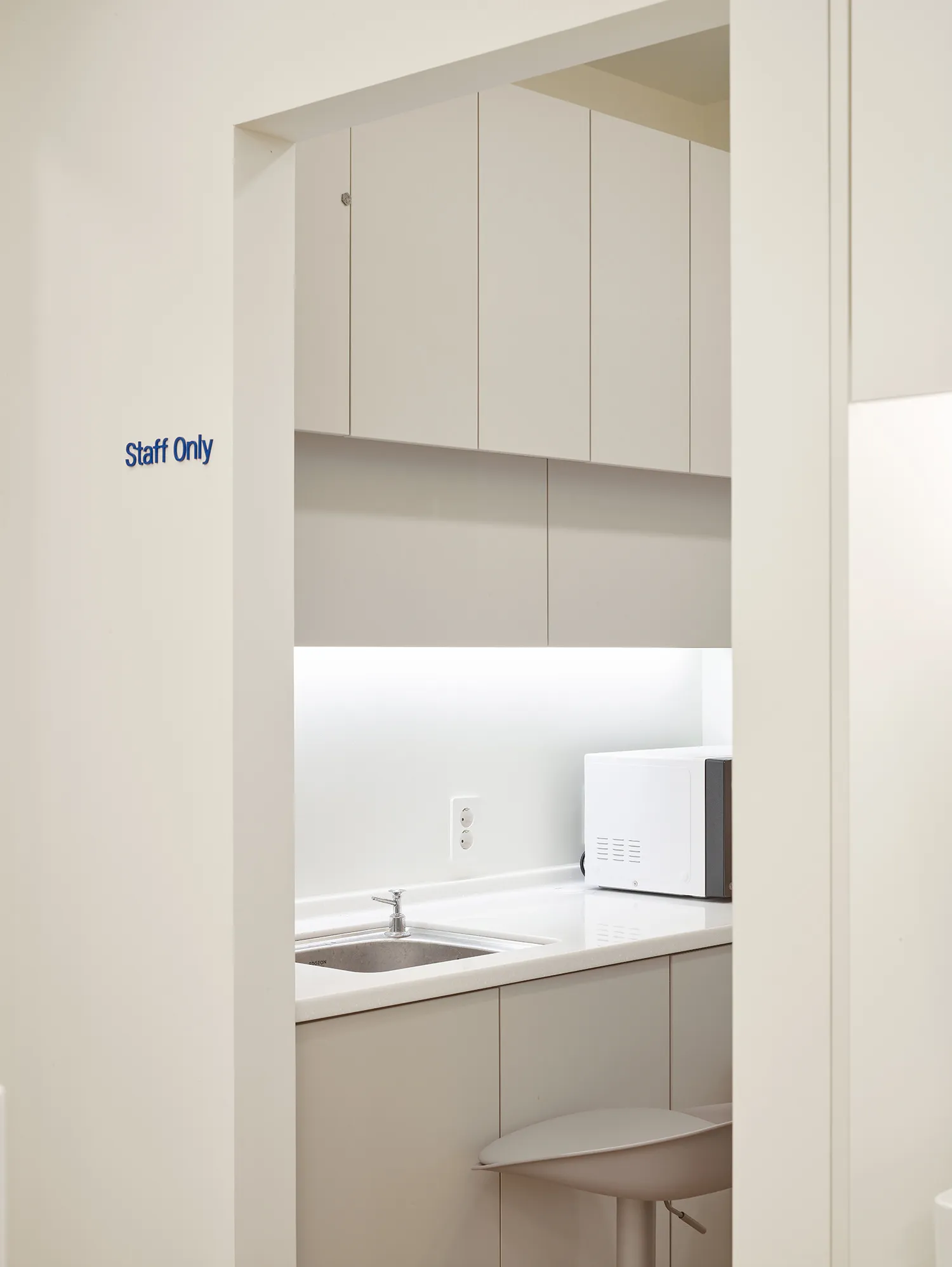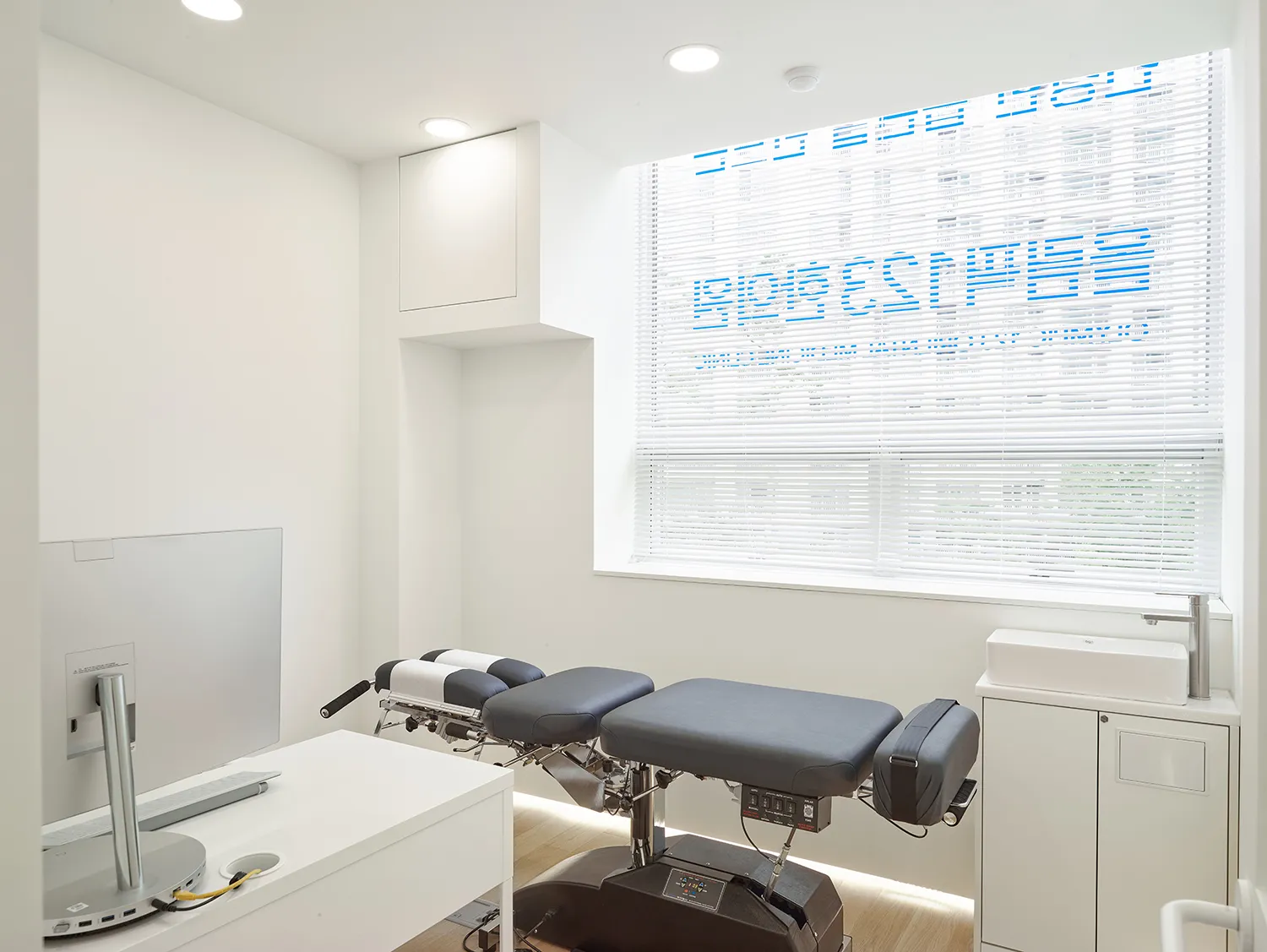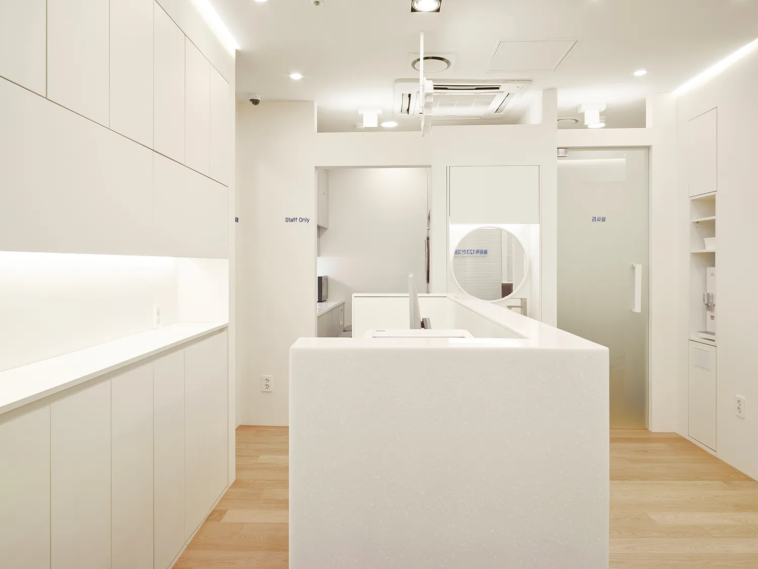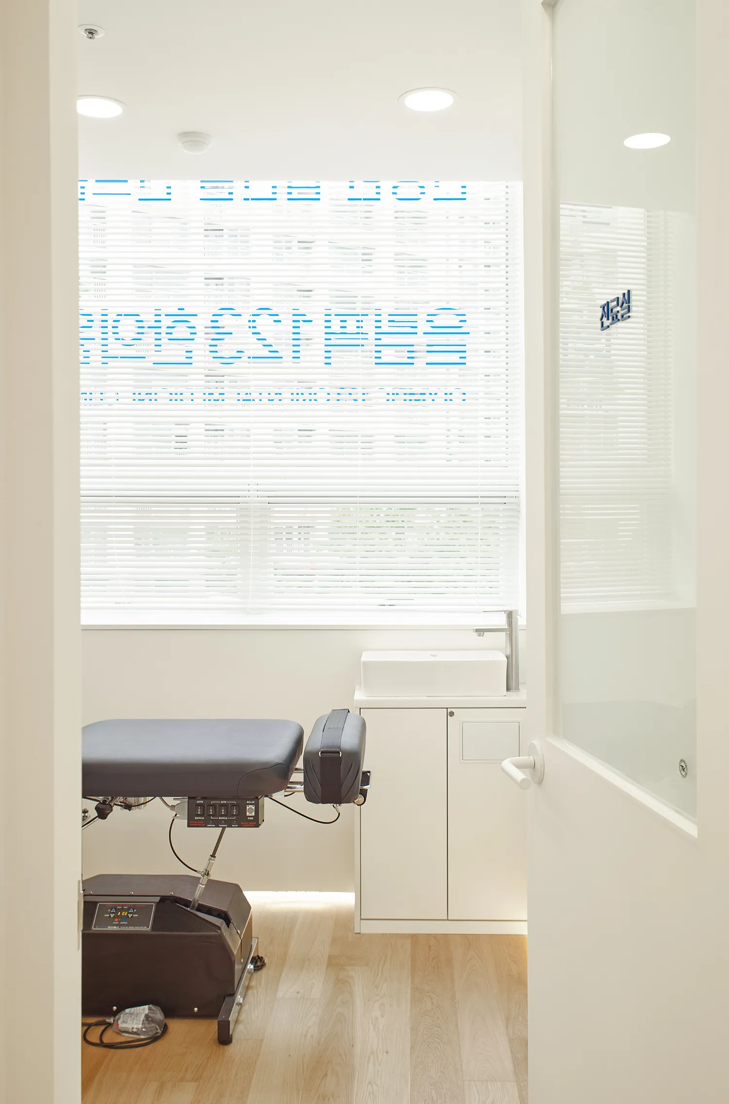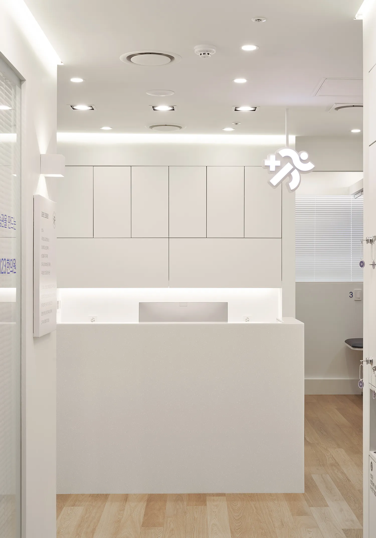 한의원 내부는 밝은 오크 원목마루와 백색의 가구와 벽으로 이루어져 답답하지 않고 편안한 느낌을 줍니다. 피트니스 공간은 운동기구의 크기와 배치를 고려하여 설계되어 작지만 불편함이 없도록 하였습니다. 그리고 지나가던 누군가 보아도 ‘아, 운동과 치료를 함께 하는 곳이구나’ 라고 생각할 수 있는, 그러나 운동을 하고있는 환자의 프라이버시는 해치지 않을 정도의 창과 블라인드를 갖추었습니다. 수납부족 해결을 위해 카운터 뒷면에도 이미지월 없이 수납장이 만들어졌습니다. 그 대신 입구를 들어서면 카운터 위에 바로 보이는 밝은 사이니지가 시선을 사로 잡습니다. 이러한 인테리어적인 요소와 곳곳에 사용된 고유의 청량한 블루 컬러는 작은 한의원이지만 공간 전체를 밝고 활기차게 해줍니다.