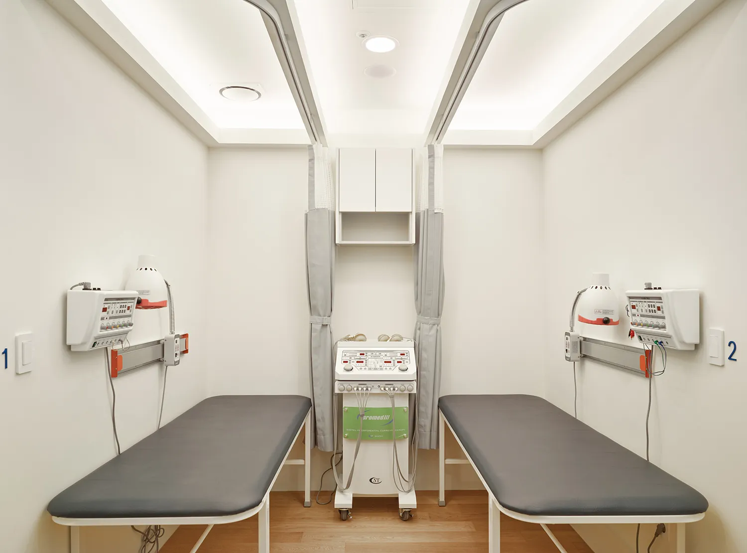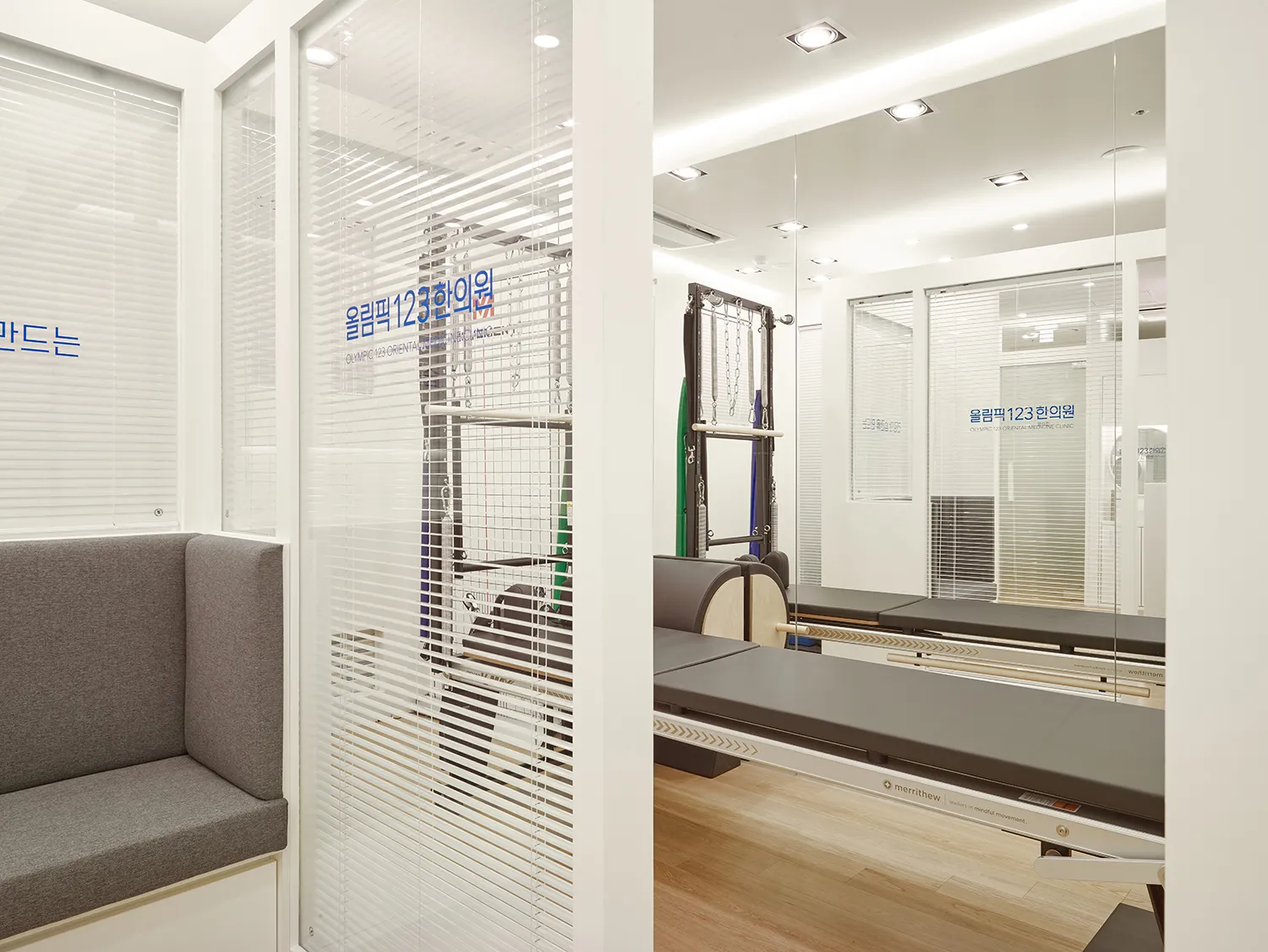 올림픽123한의원은 15평 남짓의 작은 한의원입니다. 그러나 원장님의 진료방침에 따라, 한방치료 후 운동습관을 코칭받을 수 있는 짐gym과 같은 곳이 필요했습니다. 작은 공간도 문제였지만 평면 전체가 부채꼴 형태로 특이하게 휘어져 있어 ‘진료 > 치료 > 운동’의 유기적인 동선을 만들기가 무척 어려웠습니다. 십수 차례의 평면디자인 수정을 거쳐 진료실, 4베드, 운동공간, 준비실, 검사실이 모두 제 역할을 하게 배치되었습니다.